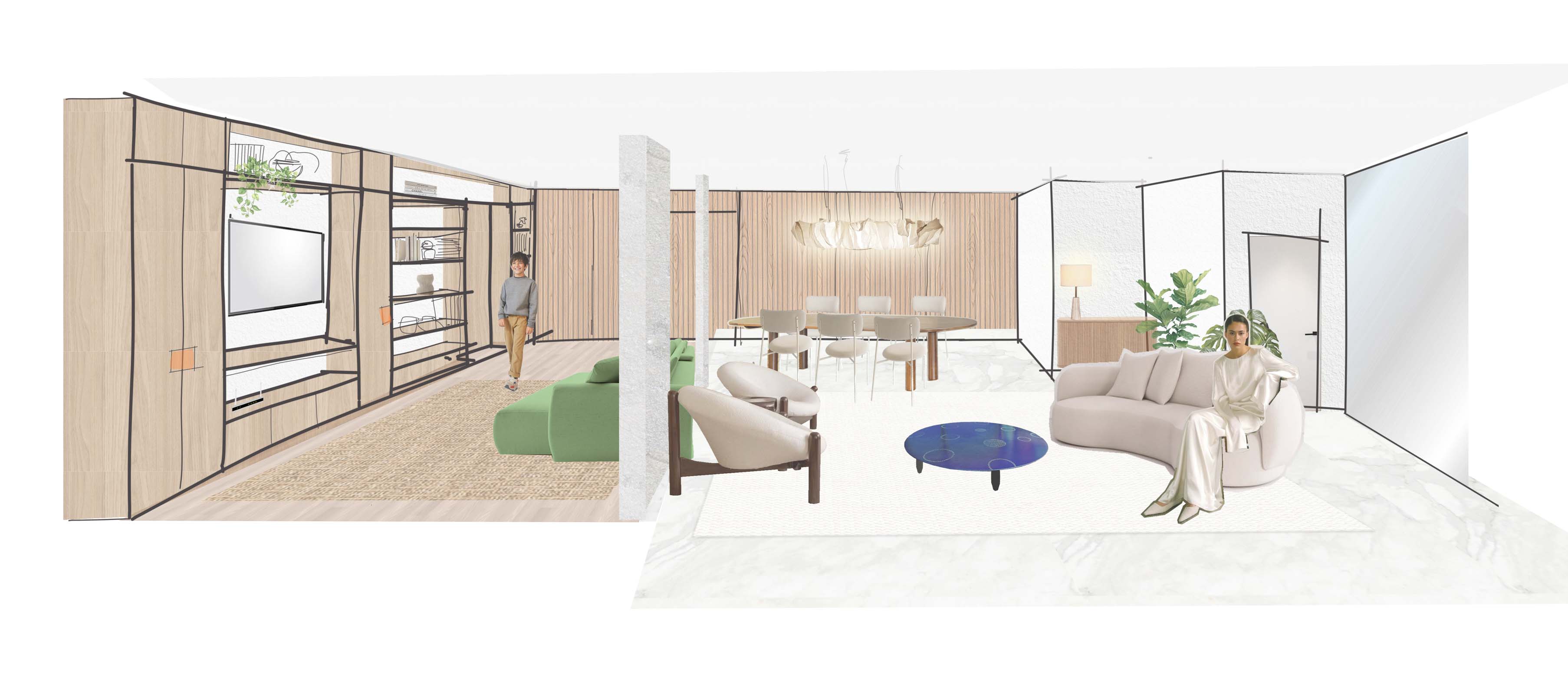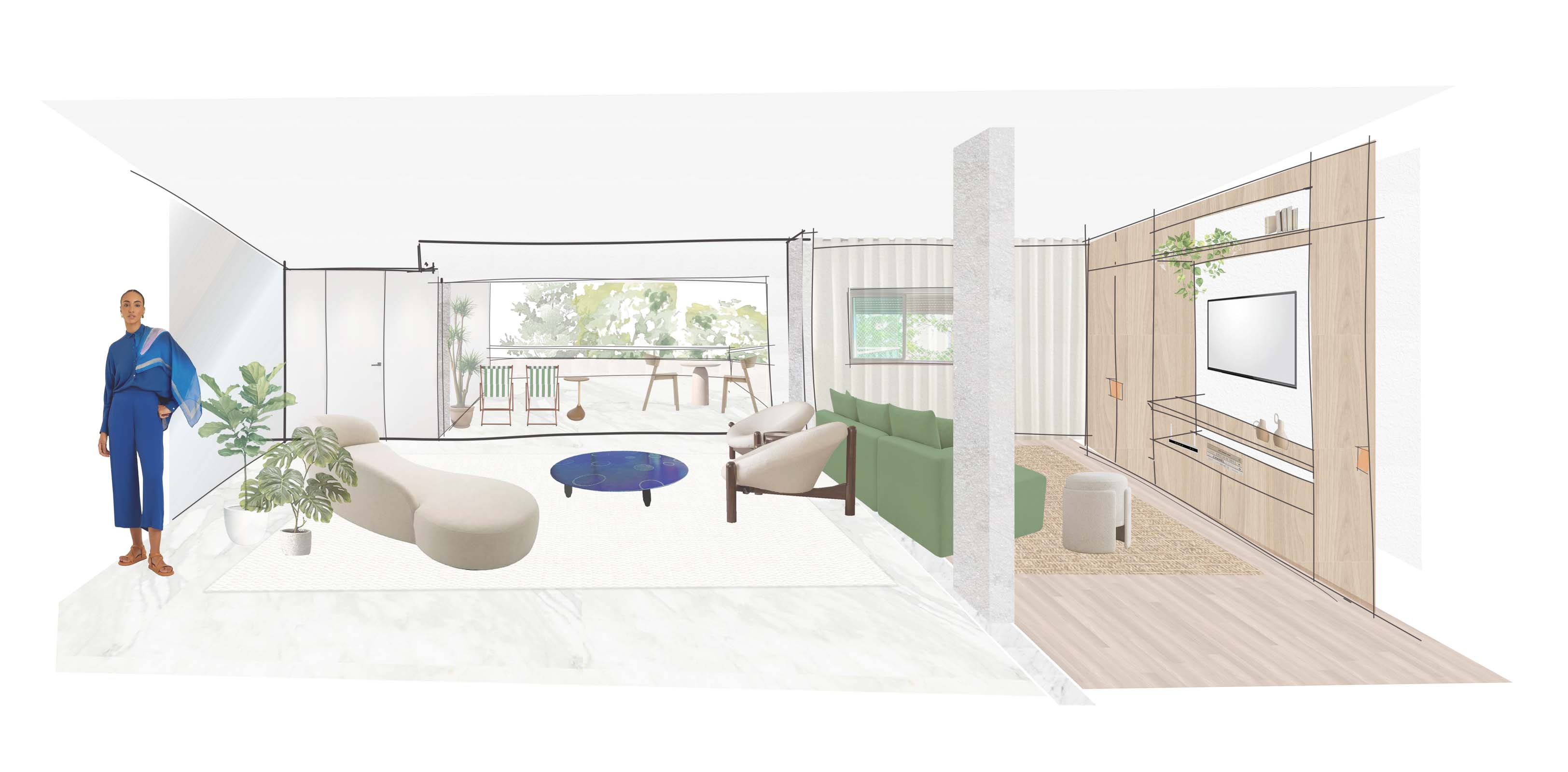 1. HALL SOCIAL, 2. LAVABO, 3. VARANDA, 4. SALA DE ESTAR. 5. SALA DE JANTAR, 6. DESPENSA, 7. BANHO DE SERVIÇO, 8. ÁREA DE SERVIÇO, 9. COZINHA, 10. SALA DE TV, 11. BANHO, 12. ESCRITÓRIO, 13. SUÍTE, 14. CIRCULAÇÃO, 15. CLOSET