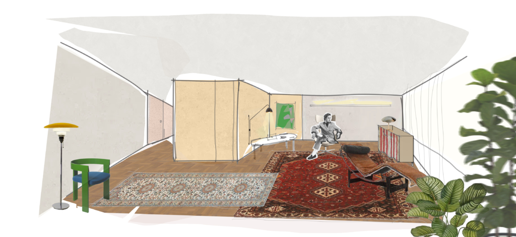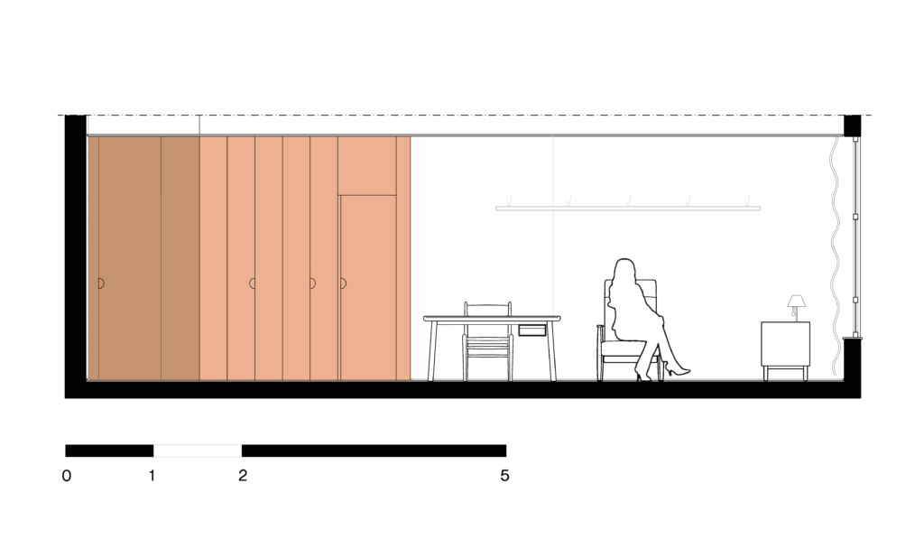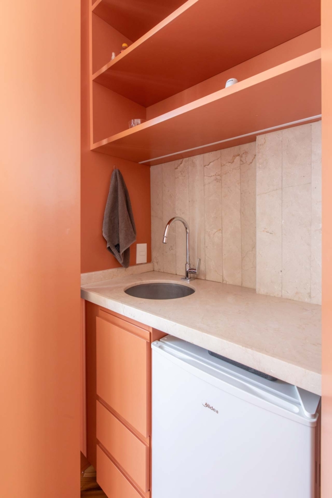 Entendemos que as soluções deveriam, além de proporcionar uma ambiência aconchegante, acomodar espaços de serviço, como uma copa para pequenos almoços; banheiro; armários funcionais para materiais de uso diário e sala de espera.