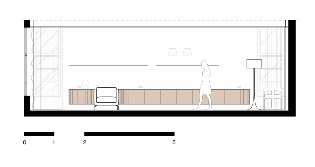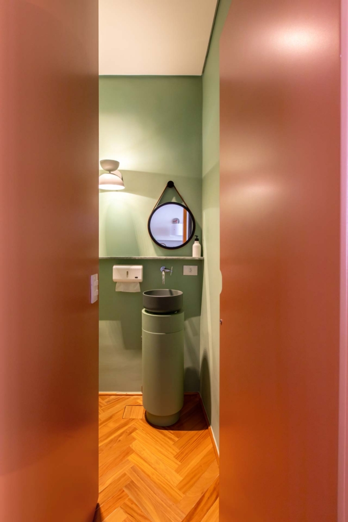 Com 30m² de área, nosso desenho vem para trazer ritmo no entendimento dessas camadas de uso. Os planos — linhas — de marcenaria se unem ao volume de serviços, que foi ampliado para acomodar os usos de forma discreta e, ao mesmo tempo, isolado do espaço de atendimento.