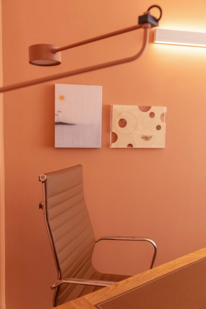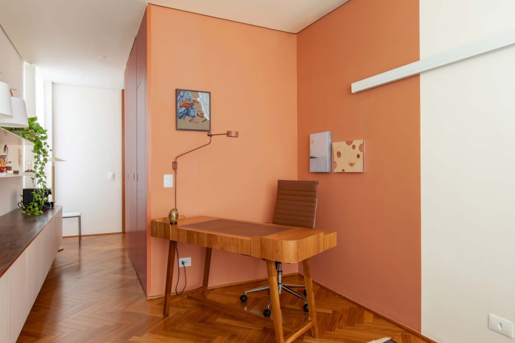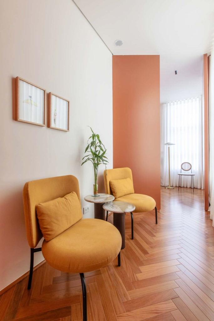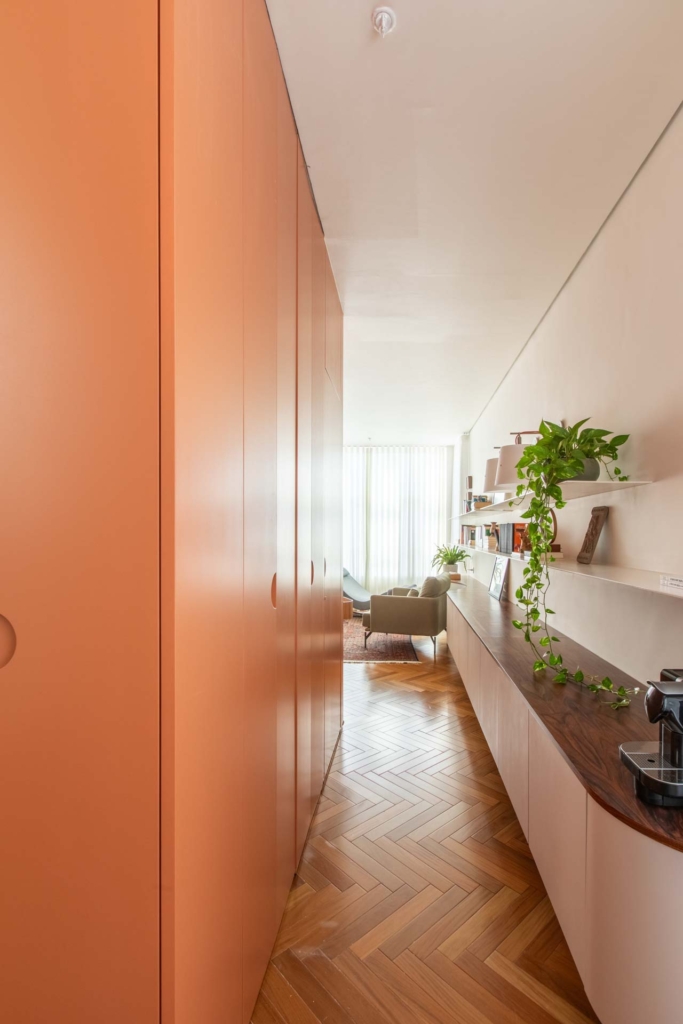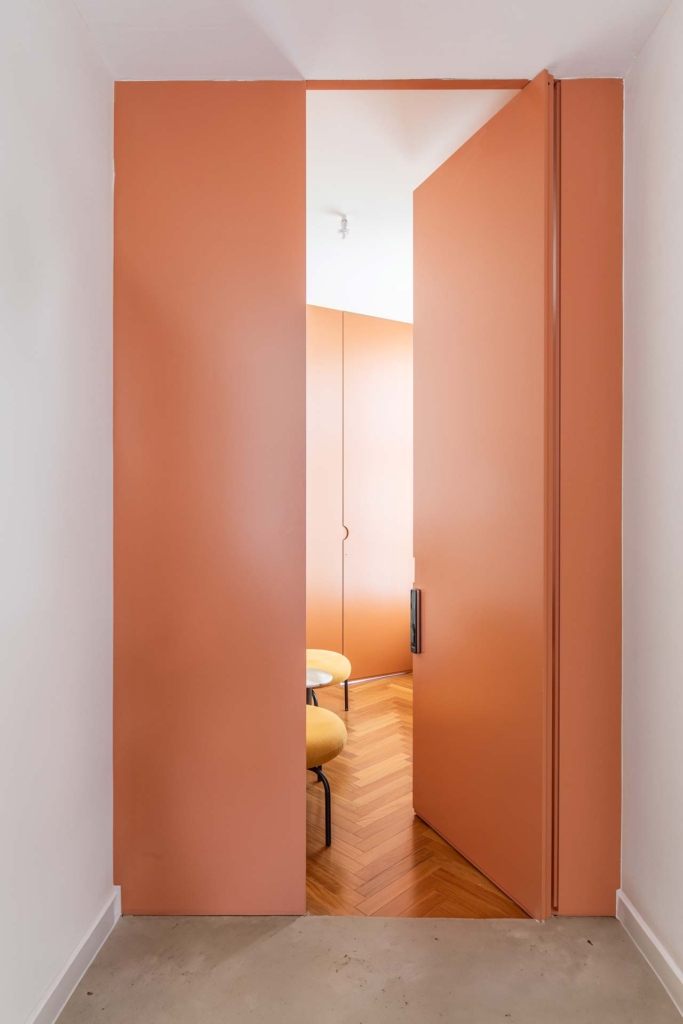 A marcenaria, em uma cor só, cria a percepção de harmonia e unidade na medida em que recebe o paciente de forma intimista e guia o acesso ao espaço do consultório, que se revela sala adentro.