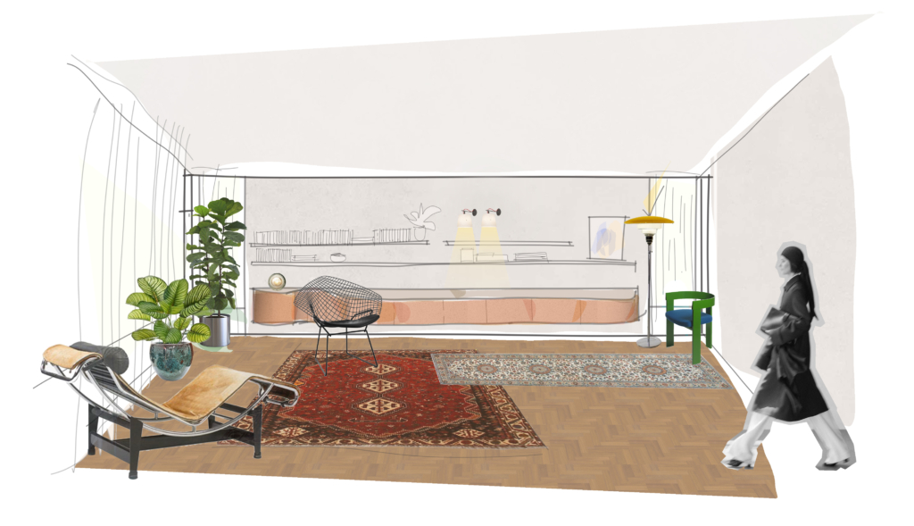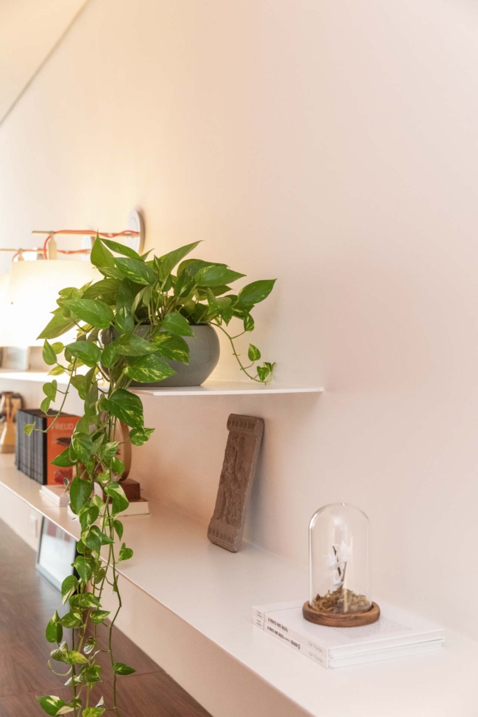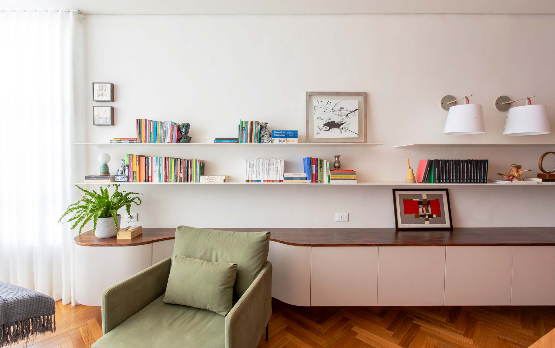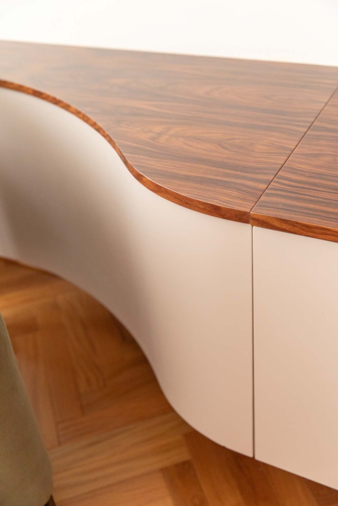 E para trazer a percepção de união e continuidade entre os espaços, desenhamos um grande aparador longilíneo com suas faces curvas, que distende a ocupação e é o protagonista do ambiente.