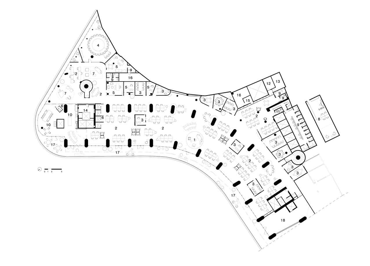 1.RECEPÇÃO, 2. MESAS DE TRABALHO, 3. SALA DE REUNIÃO, 4. SALA DE REUNIÃO CONSELHO, 5. SALA EXECUTIVOS, 6. CABINE DE CALL, 7. LOUNGE, 8. ESTÚDIO, 9. W.C., 10. COZINHA/COPA, 11. D.M.L., 12. DEPÓSITO ARQUIVOS, 13. DEPÓSITO TECNOLOGIA, 14. DEPÓSITO CAIXAS, 15. DEPÓSITO, 16. C.P.D., 17. VARANDA, 18. HALL CORPORATIVO